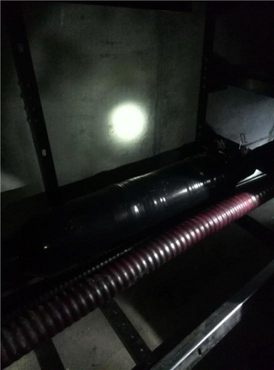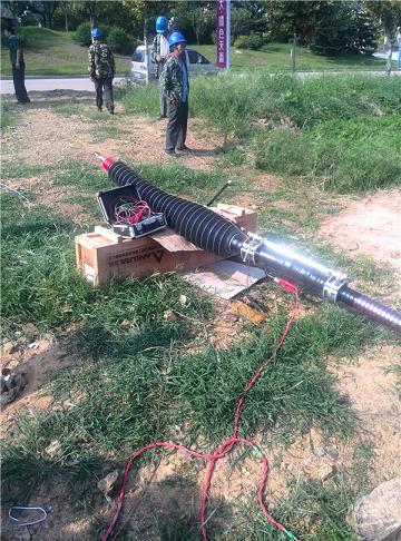 經過測距設備檢測故障位置距離測試端30米。設備再次加壓,在故障位置明顯看到有燃弧現(xiàn)象,定位完畢。